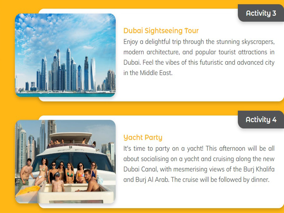 Yacht Party inclusive of 3 hours of sailing along the Dubai coast line. | Heritage Village & Old Town walking tour |
