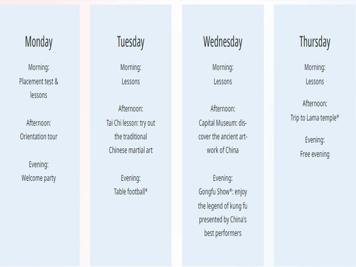 Fəaliyyətlər: İdman, pikniklər, muzeylər və görməli yerlərə ekskursiyalar, Çin rəsmləri, Tai Çi döyüş texnikası ilə tanışlıq.