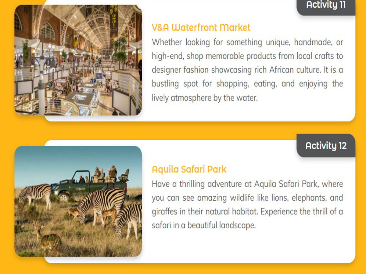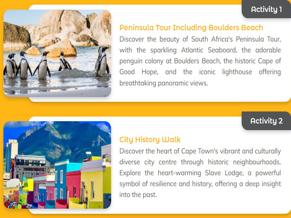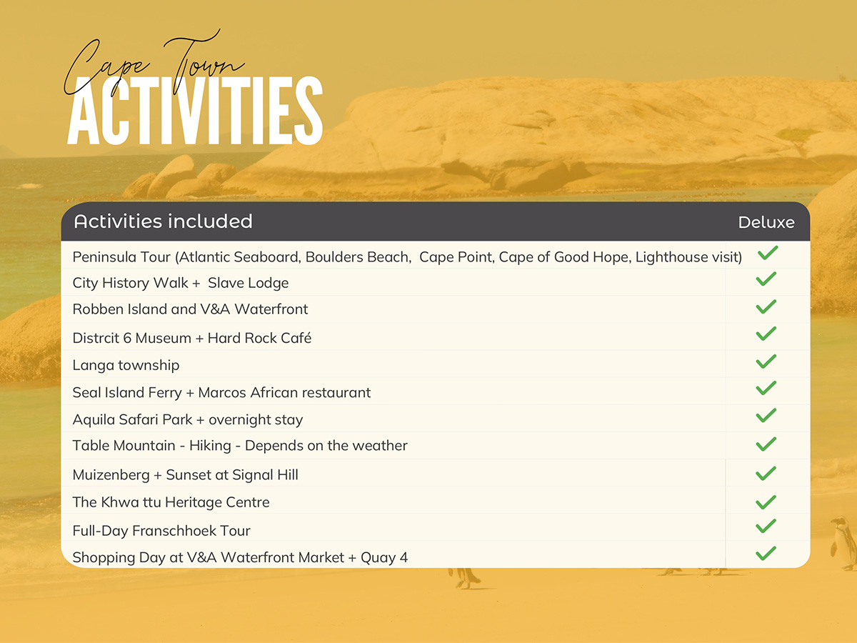 Parıldayan Atlantik okean ilə, Boulders Beach-dəki pinqvin koloniyası və tarixi ümid burnunun nəfəs kəsən panoramik mənzərələrini təqdim edən mayak ilə Cənubi Afrika Yarımadasının gözəlliyini kəşf edin. Tarixi məhəllələr ilə Keyptaunun canlı və mədəni cəhətdən mərkəzini kəşf edin. Keçmişə bələdçilik ürəkaçan Qul Locasını kəşf edin. YUNESKO-nun Ümumdünya İrsi olan Robben adasında haqsız irqi ayrı-seçkiliklə mübarizə aparan məşhur dünya lideri Nelson Man-delanın yaşadığı həbsxananı canlı görəcəksiniz. İndi o, azadlığın simvoludur. Muzeylər Kapetoniyalıların nəsillər boyu məcburi köçkünlər olmaq hekayələrini qeyd edir və küçə sənəti (Duz çayı məhəlləsində) divar rəsmlərindən istifadə edərək şəhərin hekayələrini izah edir. Yerli əhalinin mehribanlığını,rəngarəng küçə sənəti və canlı bazarları görmək üçün mədəniyyət və tarixlə zəngin Lanqa qəsəbəsini ziyarət edəcəksiniz. Yerli həyatın əsl dadını kəşf edəcəksiniz. Əyləncəli və maraqlı səyahət üçün Seal Island bərəsinə minin! Siz çoxlu suitiləri təbii yaşayış yerlərində, üzgüçülükdə görə biləcəksiniz. Bu çoxlu foto imkanları olan böyük bir macəradır. Aslanlar, fillər və zürafələr kimi heyrətamiz vəhşi təbiəti görə biləcəyiniz Aquila Safari Parkında həyəcanverici bir macəra yaşayacaqsınız. Gözəl mənzərədə safarinin həyəcanını yaşayın. Heyrətamiz şəhər və dəniz mənzərəli Masa dağına əyləncəli gəzinti. Bu əhəmiyyətli turistik məkan zirvəyə qalxmaq üçün gəzintiyə çıxan və ya kanat yolundan istifadə edən bir çox ziyarətçinin əyləncəsi olur. Khwa Ttu İrs Mərkəzində San xalqının zəngin mədəniyyətini və tarixini kəşf edin. Xoş bir mühitdə öyrənə, əylənə və əlaqə saxlaya biləcəyiniz interaktiv eksponatlardan və gözəl açıq yollardan həzz alın. Franschhoek Tramvayı ilə heyrətamiz üzüm bağlarını ilə səyahət edəcəyik! Bu əyləncəli gəzinti sizə heyrətamiz şokolatların dadına baxmağa və gözəl mənzərələri görməyə imkan verir. Bu, bölgənin ləzzətlərini araşdıraq və həzz alaq. İstər unikal, əl işi və ya yüksək səviyyəli nəsə axtarırsınızsa, yerli sənətkarlıqdan tutmuş dizayner moda nümayişi üçün zəngin Afrika mədəniyyətinə qədər yaddaqalan məhsullar alın. Bu, alış-veriş, yemək və su kənarında canlı atmosferdən həzz almaq üçün səs-küylü yerdir.