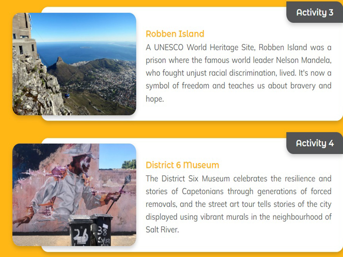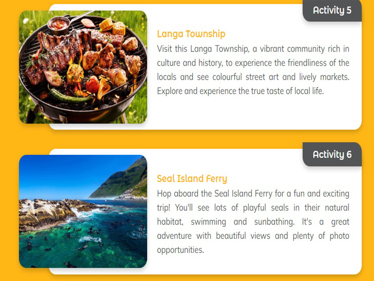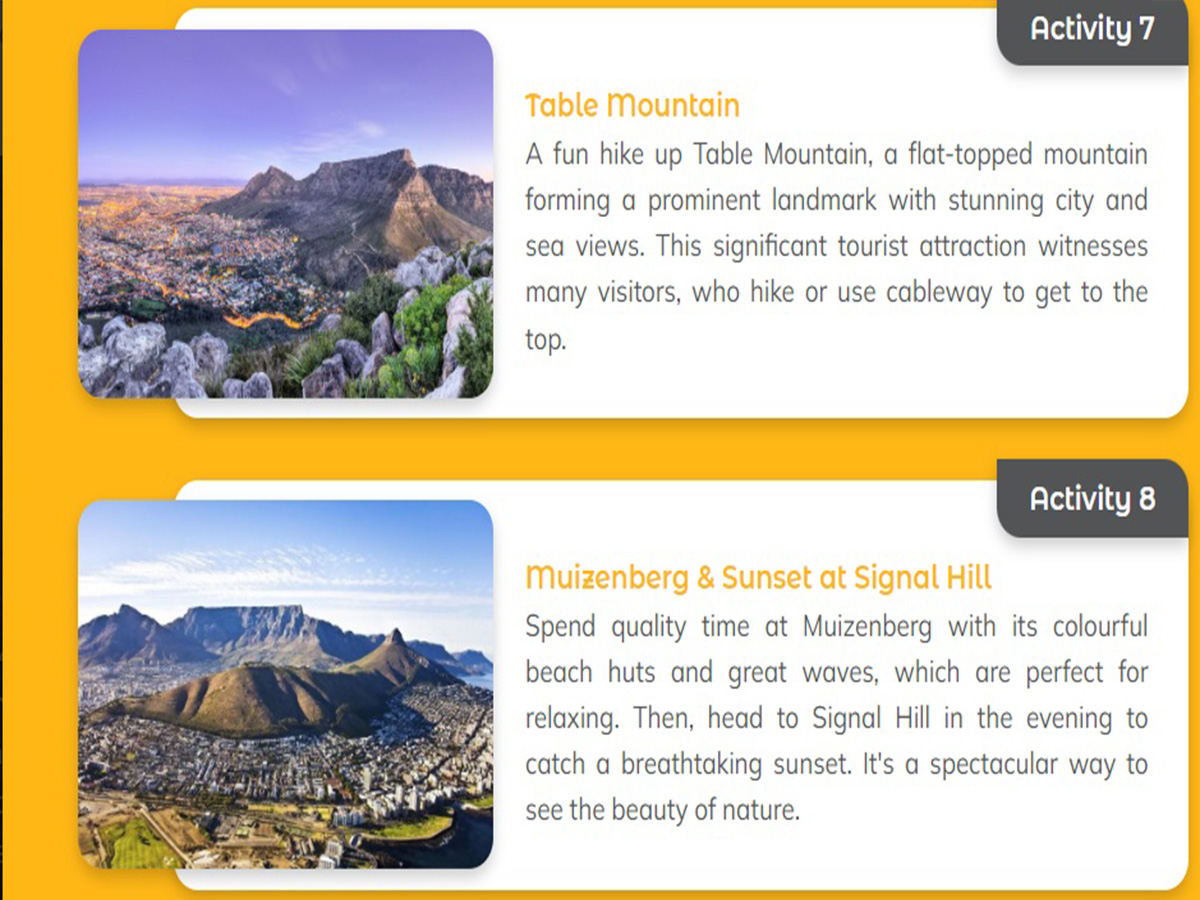 Parıldayan Atlantik okean ilə, Boulders Beach-dəki pinqvin koloniyası və tarixi ümid burnunun nəfəs kəsən panoramik mənzərələrini təqdim edən mayak ilə Cənubi Afrika Yarımadasının gözəlliyini kəşf edin. Tarixi məhəllələr ilə Keyptaunun canlı və mədəni cəhətdən mərkəzini kəşf edin. Keçmişə bələdçilik ürəkaçan Qul Locasını kəşf edin. YUNESKO-nun Ümumdünya İrsi olan Robben adasında haqsız irqi ayrı-seçkiliklə mübarizə aparan məşhur dünya lideri Nelson Man-delanın yaşadığı həbsxananı canlı görəcəksiniz. İndi o, azadlığın simvoludur. Muzeylər Kapetoniyalıların nəsillər boyu məcburi köçkünlər olmaq hekayələrini qeyd edir və küçə sənəti (Duz çayı məhəlləsində) divar rəsmlərindən istifadə edərək şəhərin hekayələrini izah edir. Yerli əhalinin mehribanlığını,rəngarəng küçə sənəti və canlı bazarları görmək üçün mədəniyyət və tarixlə zəngin Lanqa qəsəbəsini ziyarət edəcəksiniz. Yerli həyatın əsl dadını kəşf edəcəksiniz. Əyləncəli və maraqlı səyahət üçün Seal Island bərəsinə minin! Siz çoxlu suitiləri təbii yaşayış yerlərində, üzgüçülükdə görə biləcəksiniz. Bu çoxlu foto imkanları olan böyük bir macəradır. Aslanlar, fillər və zürafələr kimi heyrətamiz vəhşi təbiəti görə biləcəyiniz Aquila Safari Parkında həyəcanverici bir macəra yaşayacaqsınız. Gözəl mənzərədə safarinin həyəcanını yaşayın. Heyrətamiz şəhər və dəniz mənzərəli Masa dağına əyləncəli gəzinti. Bu əhəmiyyətli turistik məkan zirvəyə qalxmaq üçün gəzintiyə çıxan və ya kanat yolundan istifadə edən bir çox ziyarətçinin əyləncəsi olur. Khwa Ttu İrs Mərkəzində San xalqının zəngin mədəniyyətini və tarixini kəşf edin. Xoş bir mühitdə öyrənə, əylənə və əlaqə saxlaya biləcəyiniz interaktiv eksponatlardan və gözəl açıq yollardan həzz alın. Franschhoek Tramvayı ilə heyrətamiz üzüm bağlarını ilə səyahət edəcəyik! Bu əyləncəli gəzinti sizə heyrətamiz şokolatların dadına baxmağa və gözəl mənzərələri görməyə imkan verir. Bu, bölgənin ləzzətlərini araşdıraq və həzz alaq. İstər unikal, əl işi və ya yüksək səviyyəli nəsə axtarırsınızsa, yerli sənətkarlıqdan tutmuş dizayner moda nümayişi üçün zəngin Afrika mədəniyyətinə qədər yaddaqalan məhsullar alın. Bu, alış-veriş, yemək və su kənarında canlı atmosferdən həzz almaq üçün səs-küylü yerdir.