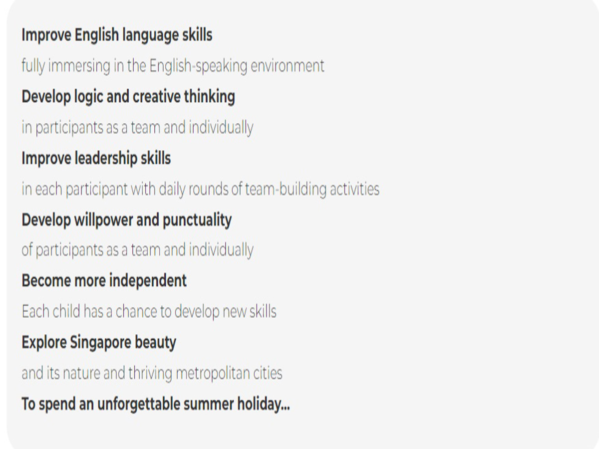 Proqramlarımız müasir dünyada çox vacib olan əqli, fiziki, sosial bacarıqların, eləcə də liderlik keyfiyyətlərinin inkişafına yönəlmiş kompleksdir. Britaniya və Amerikalı müəllimlərinin iştirakı ilə keçirilən dərslər sizin ingilis dili səviyyənizi artıracaq. Dərslər, oyunlar və digər interaktiv fəaliyyətlər zamanı məhsuldar iş üçün əyləncəli atmosfer yaradırıq. Biz hər axşam dərslərdən sonra asudə vaxtlarımızda özünə inam, ictimai nitq bacarıqları, komandada işləmək bacarığı, qərar qəbul etmə və bir çox digər vacib keyfiyyətləri inkişaf etdirən oyunlar və fəaliyyətlər təşkil edirik. Düşərgədə qaldığınız müddət ərzində biz ölkənin ən canlı və vacib attraksionlarına müxtəlif turlar və ekskursiyalar təklif edirik.