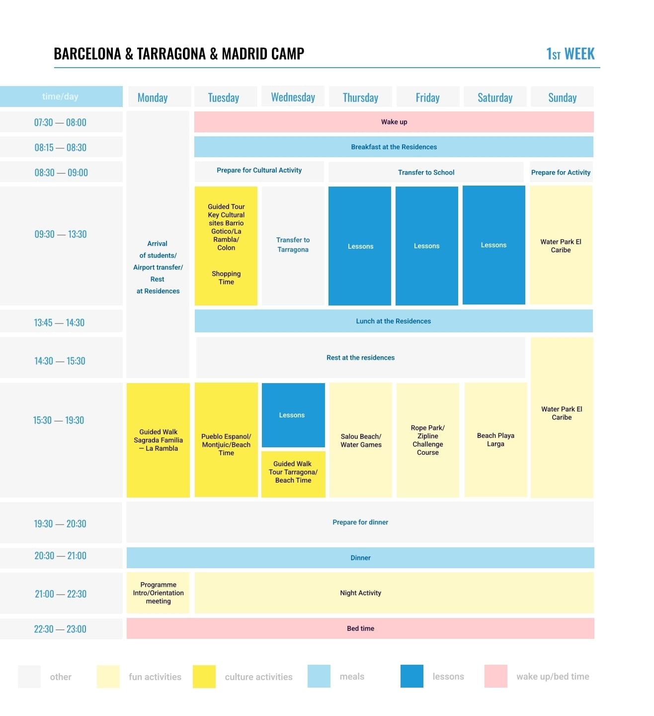 Barselonadakı İspan məktəbimiz bizim qürurumuz və sevincimizdir. Barselona tələbələrin diqqət mərkəzində olan böyük və müasir təcrübə mühitidir. Siz ispan və ingilis dilini işıqlı,geniş sinif otaqlarında öyrənəcəksiniz. Öyrəndiyiniz ispan və ingilis dilini sınadığınız zaman məktəbin günəşli açıq həyətində yeni dostlar qazana biləcəksiniz. Bütün düşərgə ərazisində WiFi dan istifadə edərək şəhəri kəşf etməyə hazırlaşa bilərsiniz. Dərslərdən sonra şəhər gəzintisi olacaq sonra isə özünüzü möhtəşəm LEixample məhəlləsində tapacaqsınız.